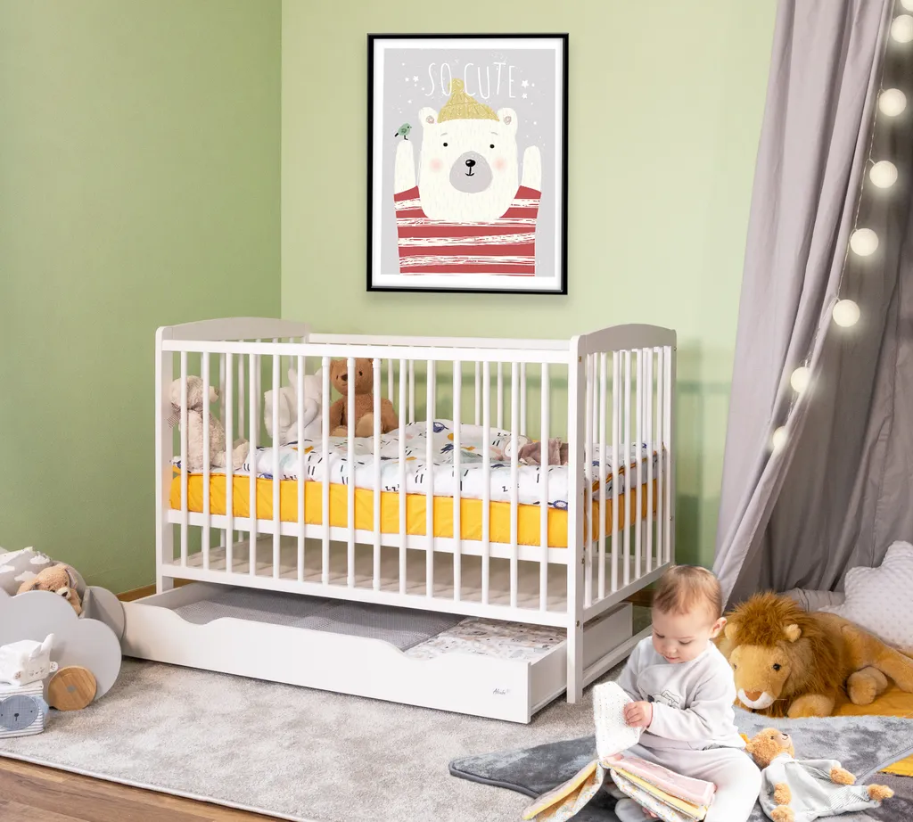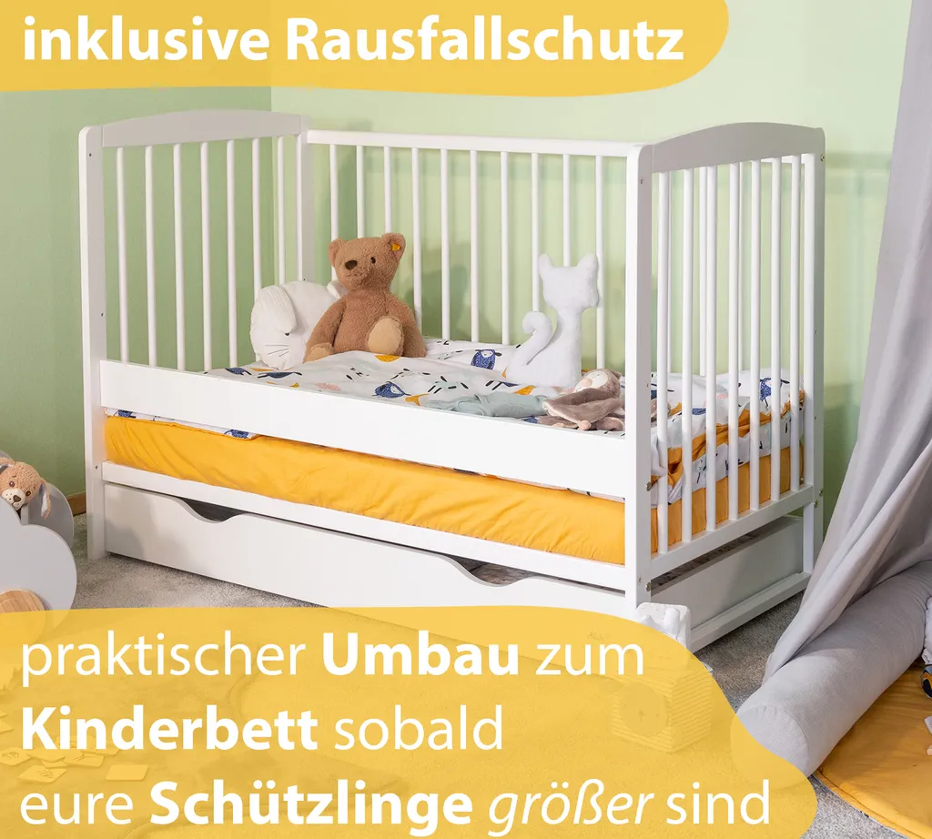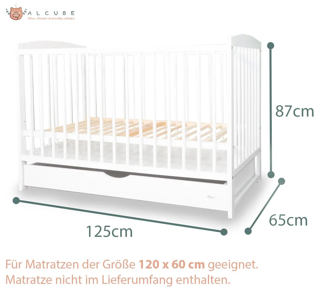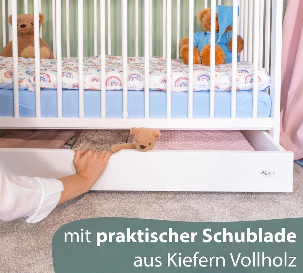 Alcube® Mitwachsendes Babybett 60 X 120 Cm Mit Schublade Gitterbett 120×60 Kiefernholz Zum Kinderbett Umbaubar In Weiß