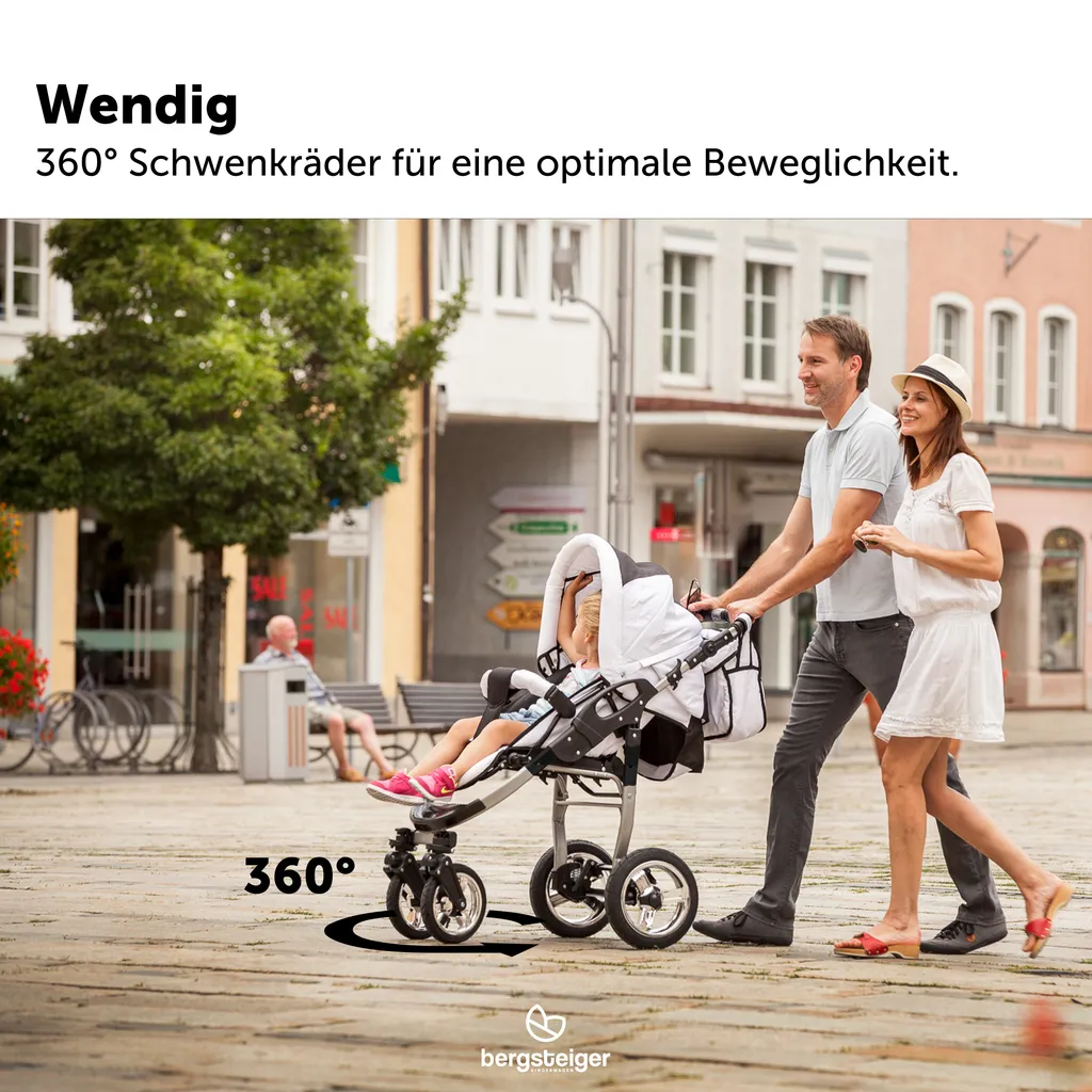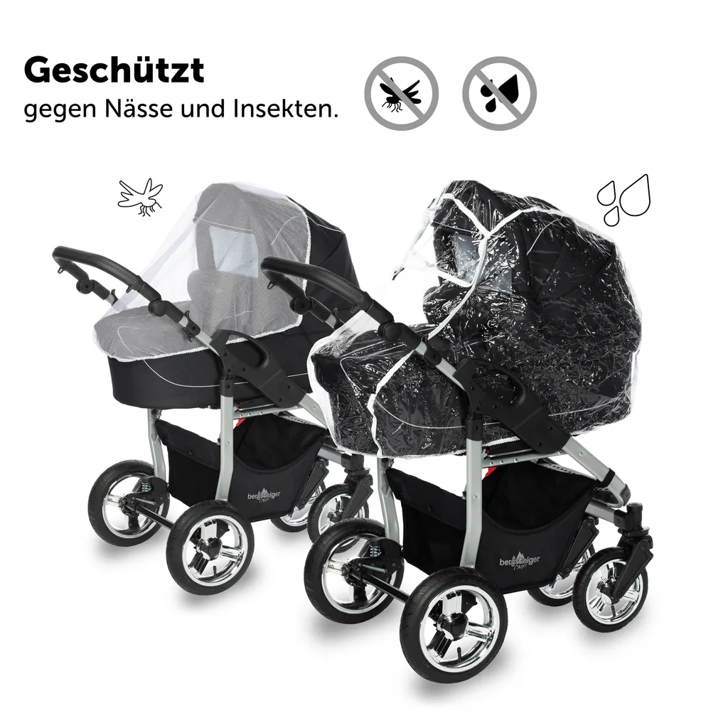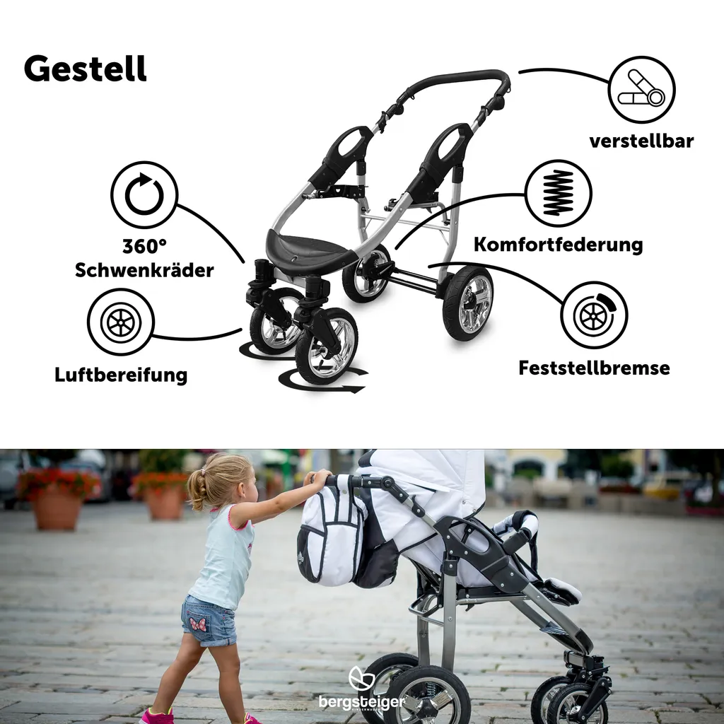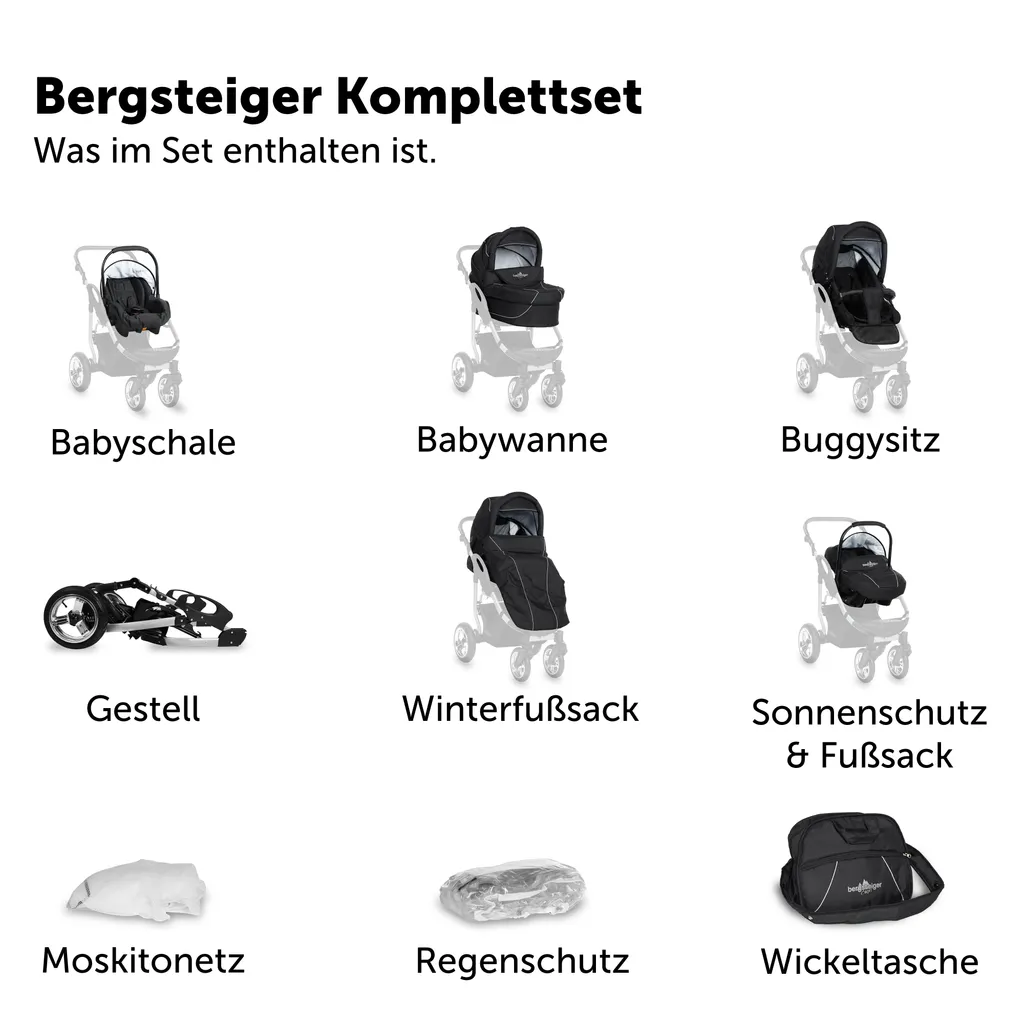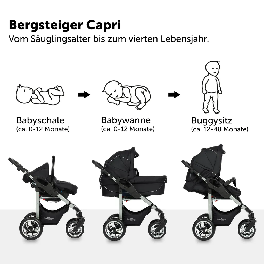 Bergsteiger Capri Kinderwagen, Farbe: Black Edition / Gestell: Silber, 3-in-1 Kombikinderwagen, Inkl. Babyschale, Babywanne, Sportwagen Und Zubehör