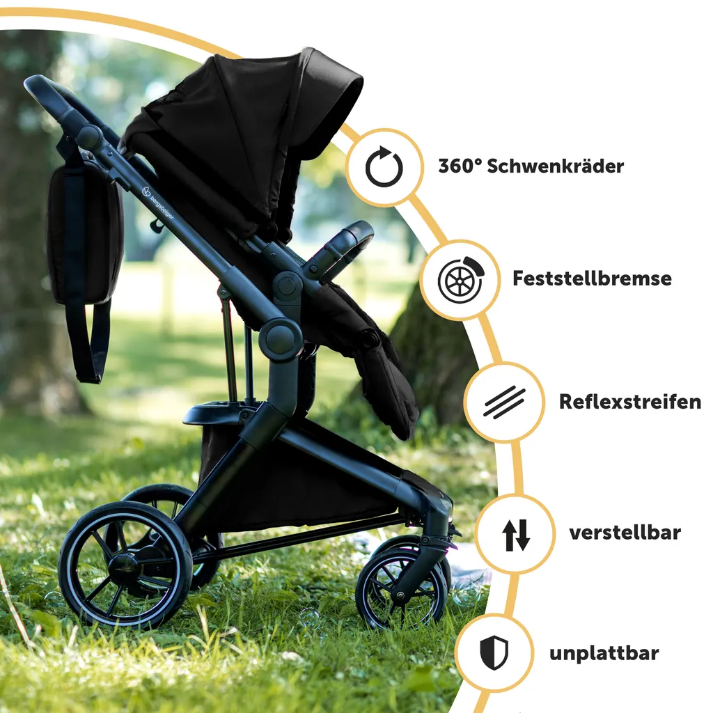 Bergsteiger Lugo Kinderwagen, Farbe: Black / Gestell: Black, Kombikinderwagen Komplettset Inkl. Zubehör – Babyschale, Buggy-Aufsatz, Sonnenschutz & Wetterfußsack | Isofix Station Erhältlich