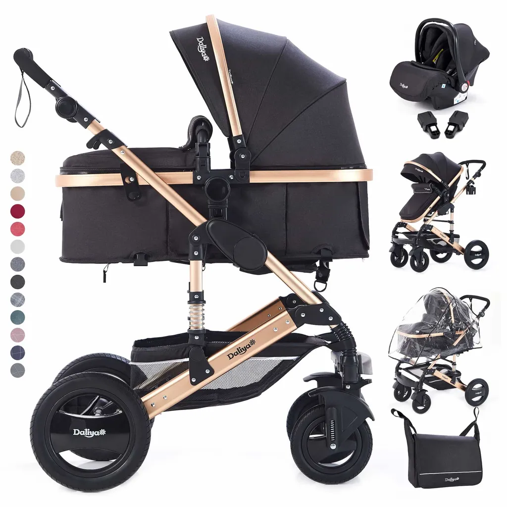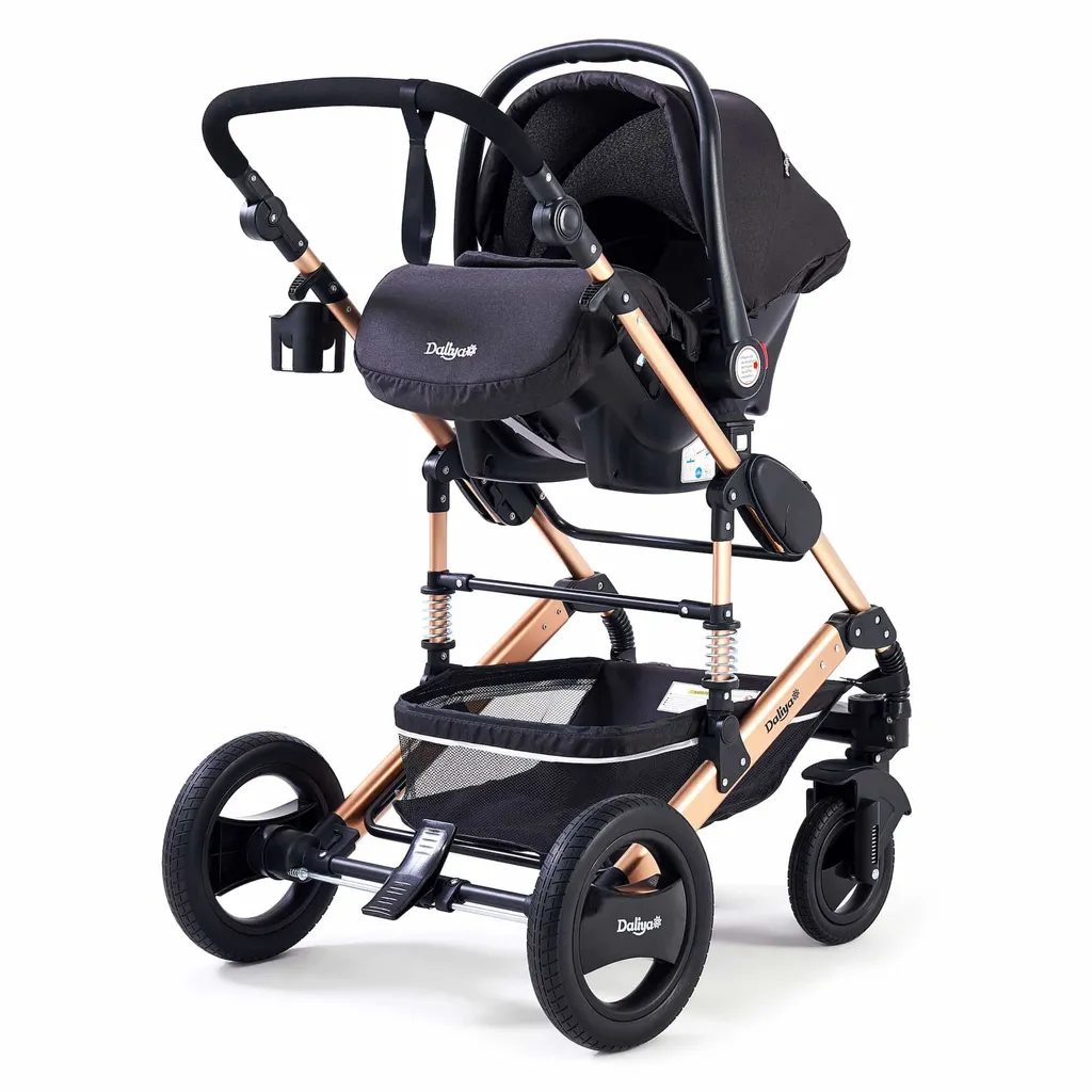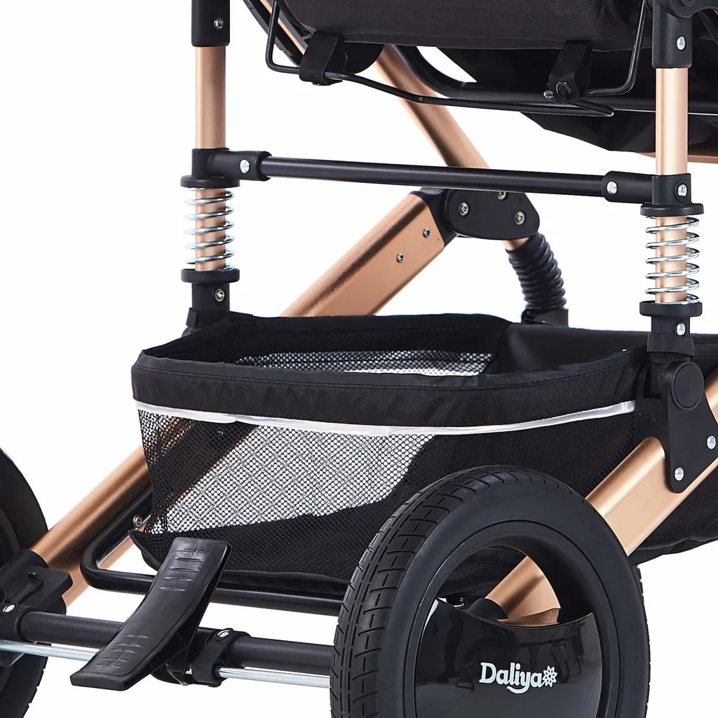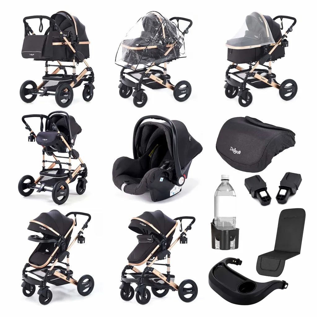 Daliya® 3in1 Kinderwagen Bambimo Kombikinderwagen 15-Teile Set In Schwarz Gold Incl. Babywanne & Buggy & Auto-Babyschale & Alu-Gestell & Gummireifen & Mehr