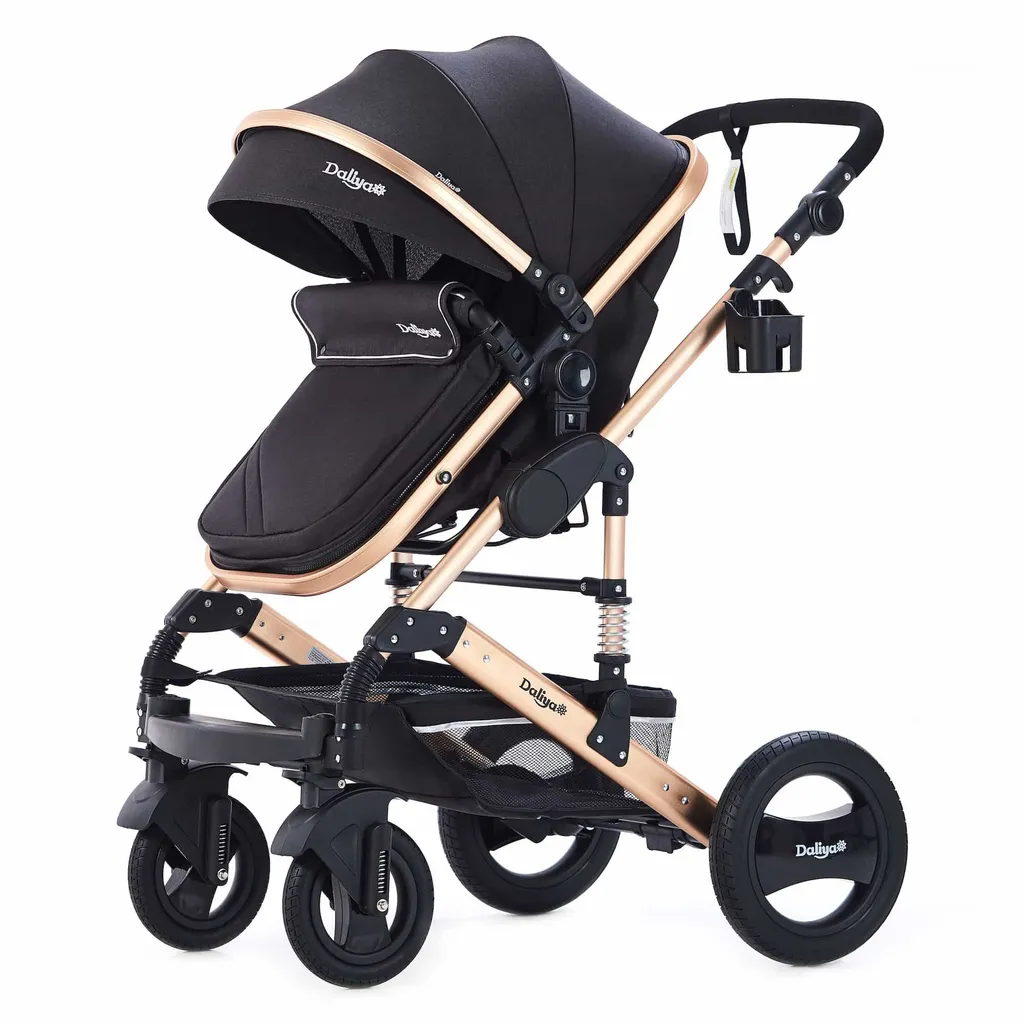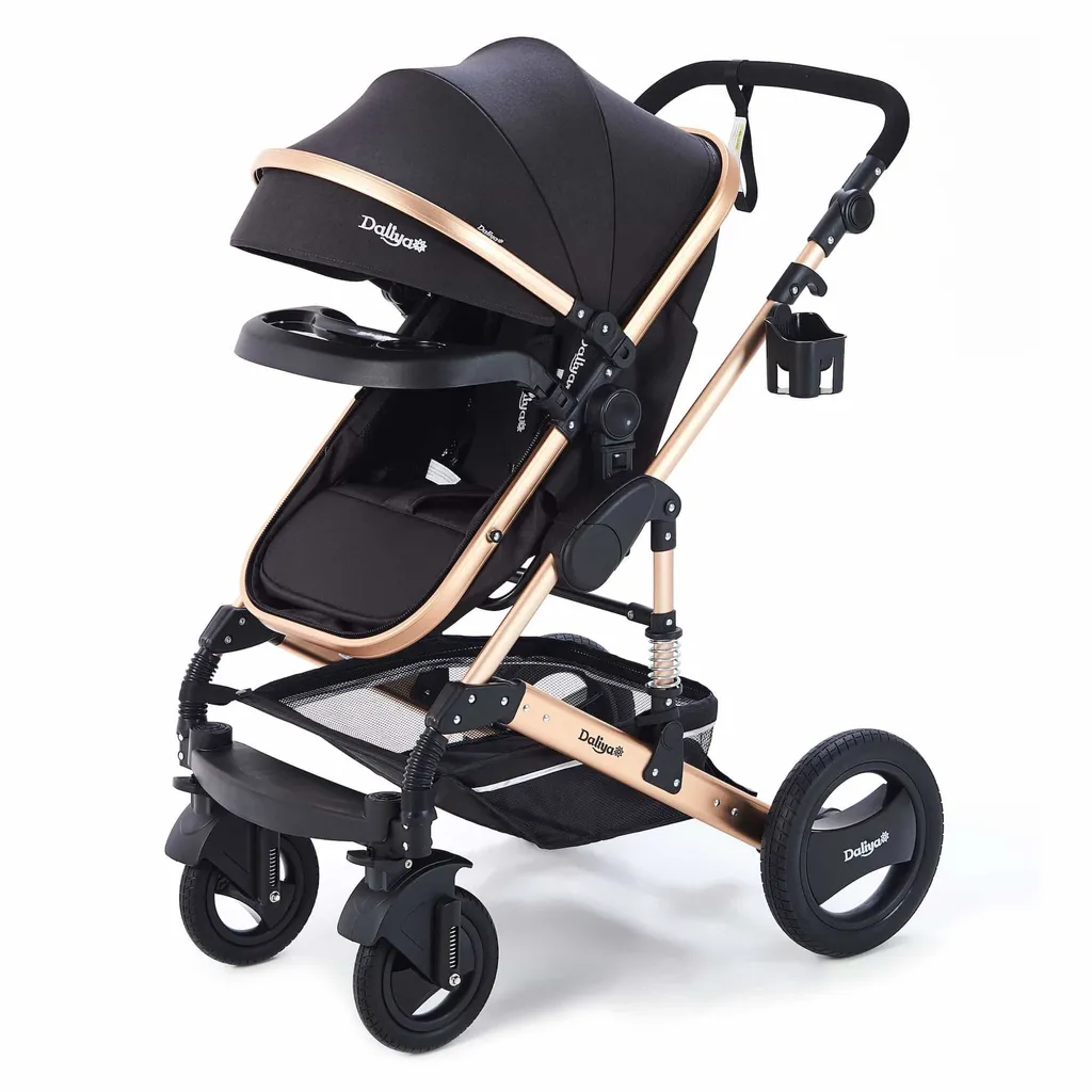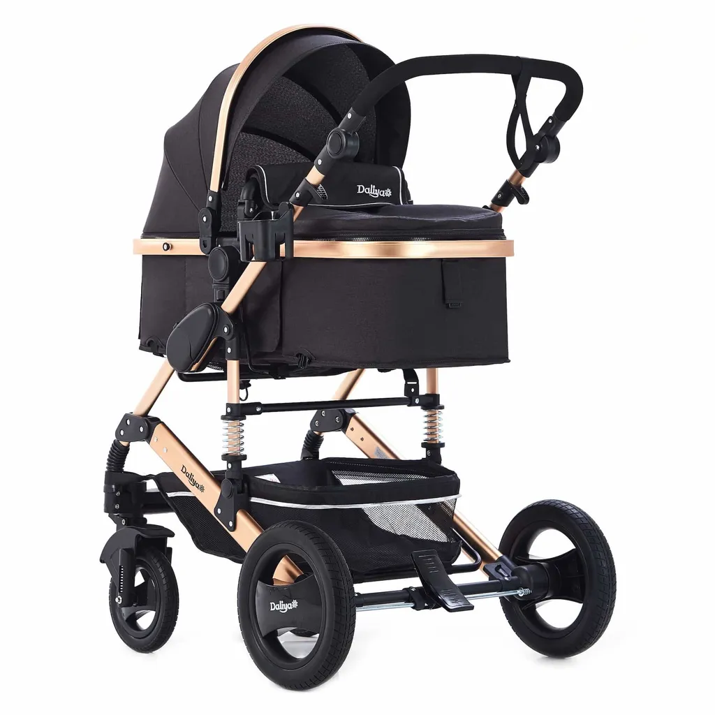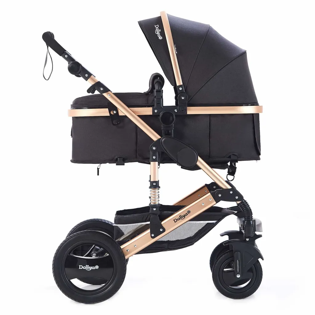 Daliya® 3in1 Kinderwagen Bambimo Kombikinderwagen 15-Teile Set In Schwarz Gold Incl. Babywanne & Buggy & Auto-Babyschale & Alu-Gestell & Gummireifen & Mehr