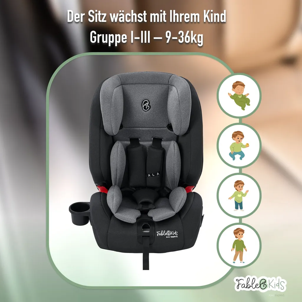 FableKids NALA Autokindersitz Autositz Kinderautositz Mit Isofix 9-36kg Gruppe 1+2+3 ECE Grau